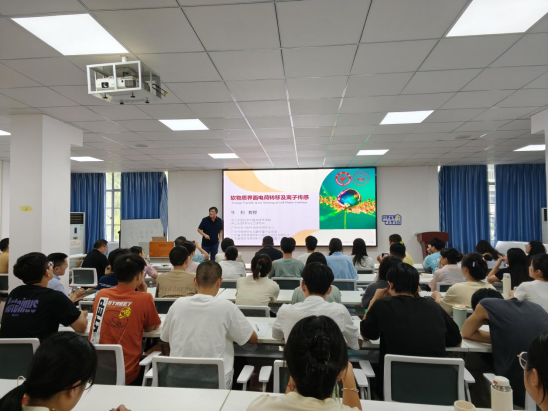 牛利教授的报告题目为“软物质界面电荷转移及离子传感”。牛利教授提出了液液界面上电子转移的Frumkin热力学因子,认为液液界面上电势仅改变物种界面的浓度,从而引起双电层浓度效应,该理论统一了多种差异化的电子转移速率和相间电势关系结果。从传统四电极系统的单极化液液界面,发展到双极化液/液界面系统,利用电子耦合离子转移机制(ET-IT) 克服了电位窗限制的难题,极大地拓展了离子伏安分析的应用体系。在软物质界面上不仅实现了微纳材料的设计构造及生长,同时赋予其剪裁修饰的软物质界面多种离子敏感功能。利用多种纳米复合组分,构造了多种固接离子电位传感体系,发展了简便的无膜固态离子传感技术。引入了多种离子敏感技术测量方法,综合多种构造离子传感的工程技术,探索了离子敏感的多场景应用。师生们对牛利教授的研究成果十分感兴趣,与牛利教授积极互动、交流。