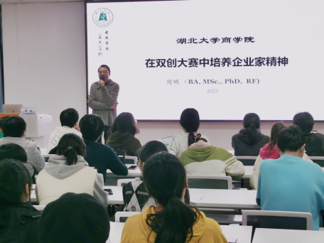 讲座伊始,周明老师以常见的生活现象——“老员工90%的创业都会失败”为例引出创业的本质,通过讲解创新创业竞赛的选题、前期规划、PPT展示、团队分工等内容,认真分享了“双创”竞赛的宝贵经验。