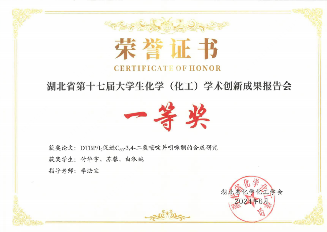 付华宇,中共党员,2021级化学(师范类)专业本科生,保研至南开大学化学公司。现任班级学习委员,曾任化院青志秘书部负责人。前三学年加权成绩排名专业第一,连续三年获一等优秀员工奖学金以及国家奖学金、一等金献师范生奖学金、文体活动奖学金等8项奖学金;获三好员工标兵、优秀共青团员、三好员工、优秀志愿者等多个荣誉称号。获省级大创2项、湖北省化学化工学术创新成果报告会一等奖,以第一发明人获实用新型专利一项,以第二作者在省级期刊上发表学术论文一篇,以参与者在《SCIENCE CHINA Materials》期刊上发表学术论文一篇。
